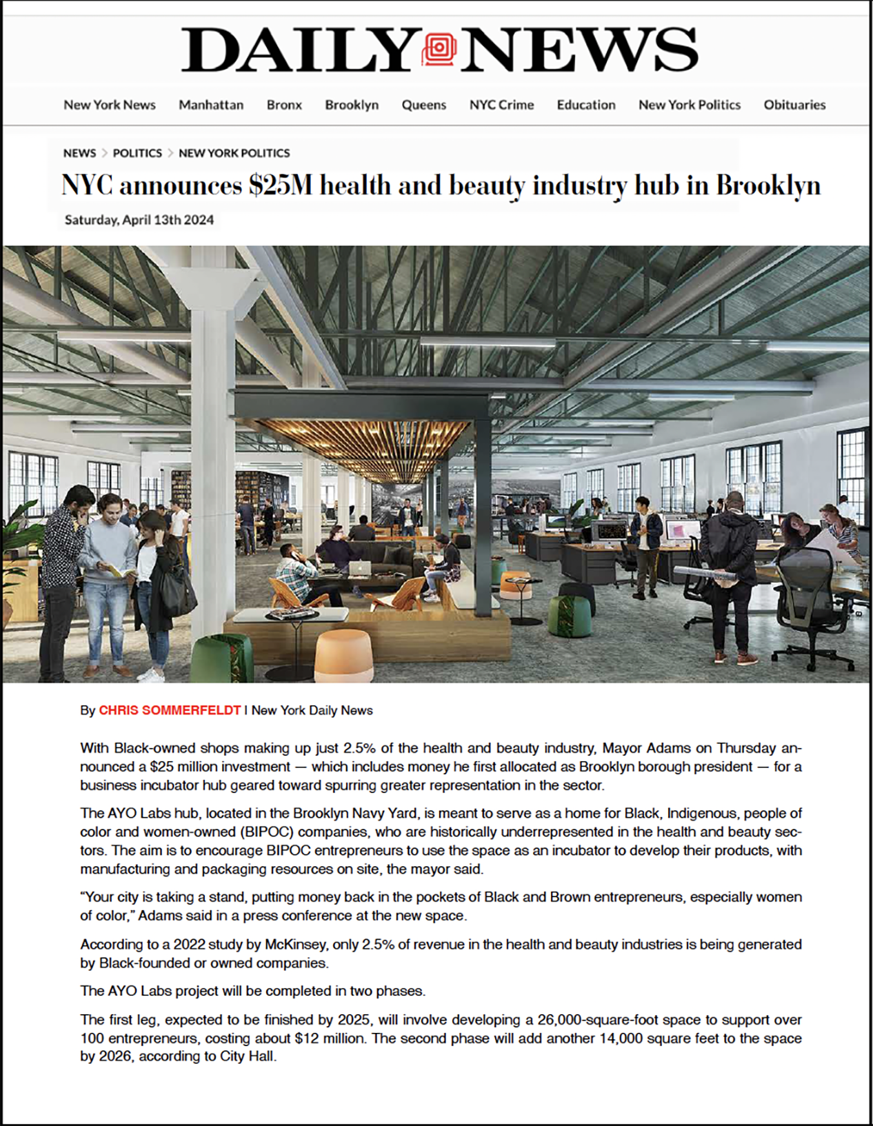 ”With Black-owned shops making up just 2.5% of the health and beauty industry, Mayor Adams on Thursday announced a $25 million investment — which includes money he first allocated as Brooklyn borough president — for a business incubator hub geared toward spurring greater representation in the sector. The AYO Labs hub, located in the Brooklyn Navy Yard, is meant to serve as a home for Black, Indigenous, people of color and women-owned (BIPOC) companies, who are historically underrepresented in the health and beauty sectors. The aim is to encourage BIPOC entrepreneurs to use the space as an incubator to develop their products, with manufacturing and packaging resources on site, the mayor said.”