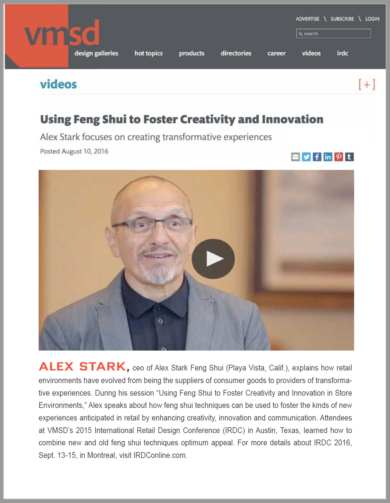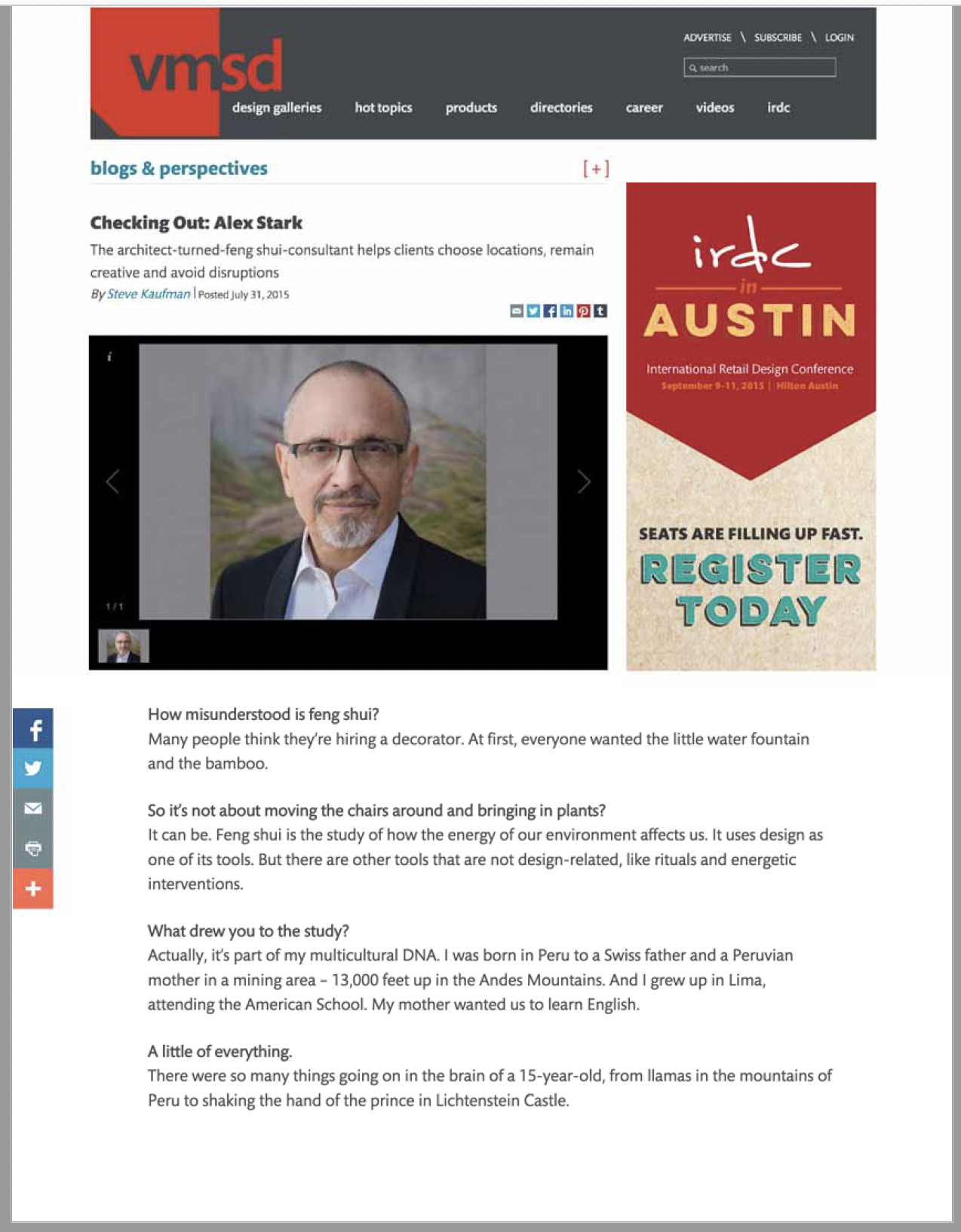 “A feng shui master, a color consultant, and an organizational expert analyze three designers’ workspaces and sum up their occupants’ styles… An architect by training, Alex Stark has been practicing feng shui for 10 years and works as an independent consultant in New York. He most often advises designers on hospital and healthcare projects, but he has also advised the United Nations Development Program on issues of urban development”