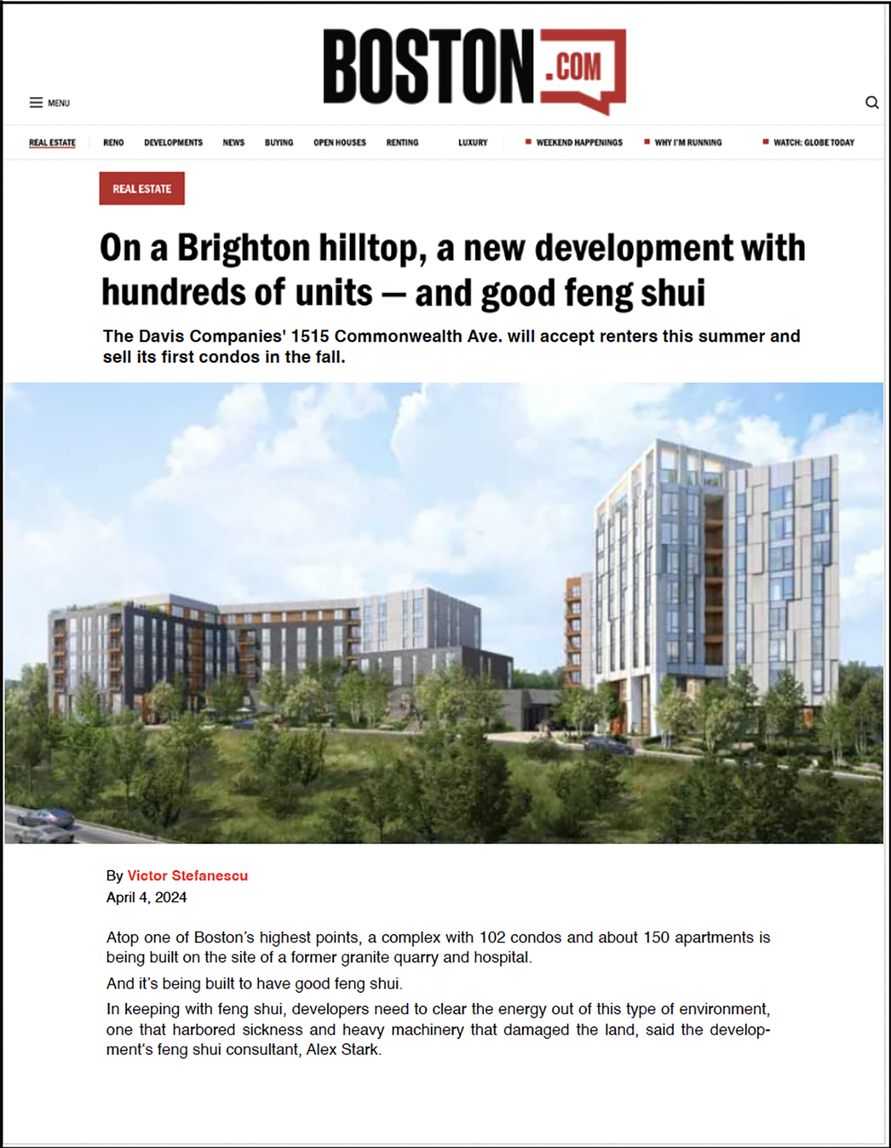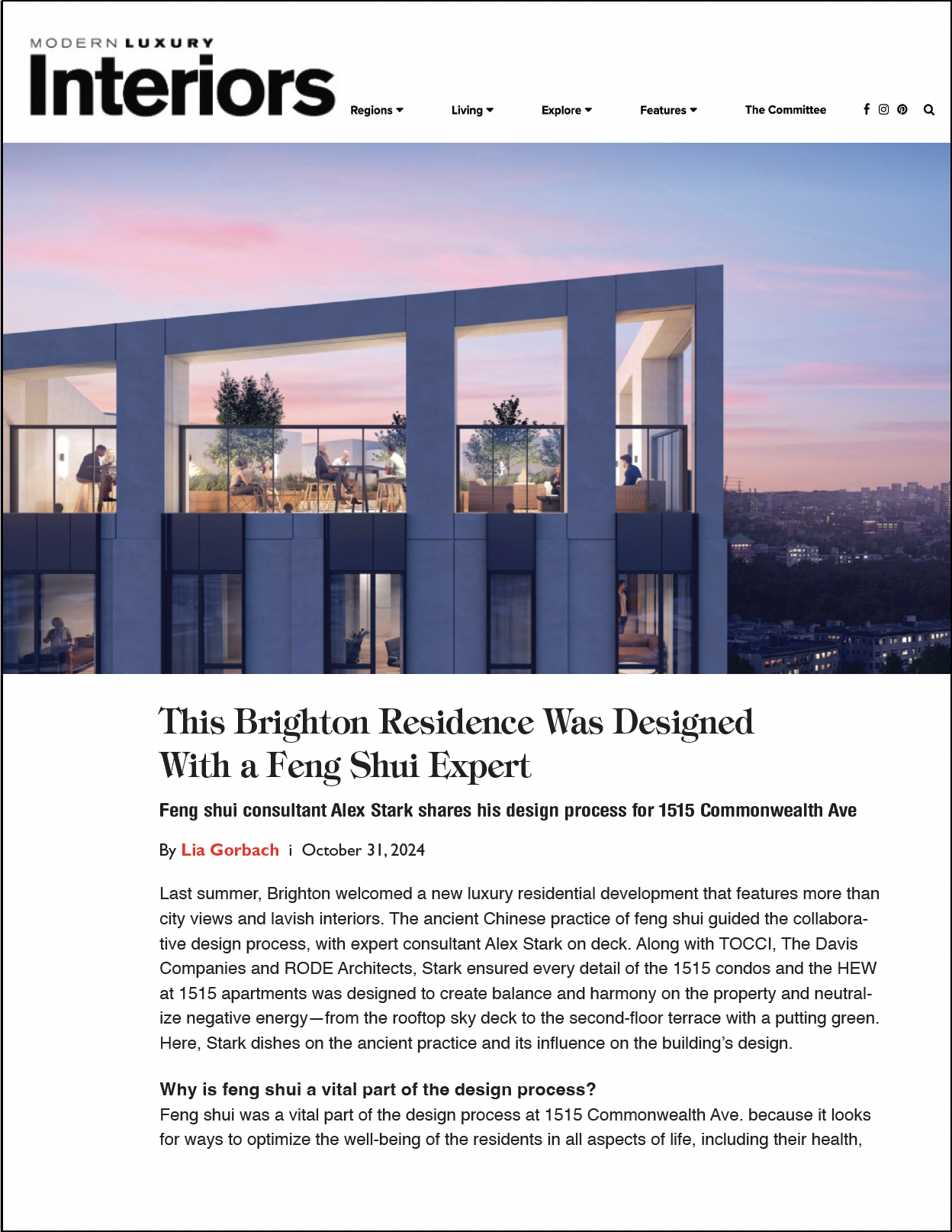 ”Last summer, Brighton welcomed a new luxury residential development that features more than city views and lavish interiors. The ancient Chinese practice of feng shui guided the collaborative design process, with expert consultant Alex Stark on deck. Along with TOCCI, The Davis Companies and RODE Architects, Stark ensured every detail of the 1515 condos and the HEW at 1515 apartments was designed to create balance and harmony on the property and neutralize negative energy—from the rooftop sky deck to the second-floor terrace with a putting green. Here, Stark dishes on the ancient practice and its influence on the building’s design..”