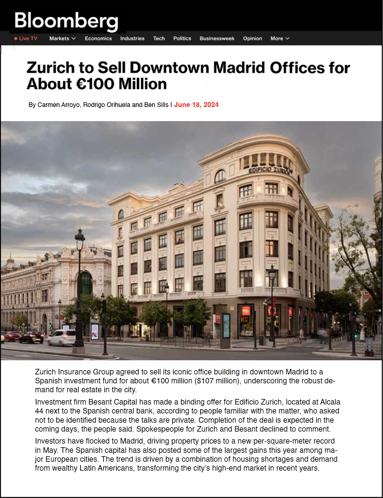 ”Zurich Insurance Group agreed to sell its iconic office building in downtown Madrid to a Spanish investment fund for about €100 million ($107 million), underscoring the robust demand for real estate in the city. Investors have flocked to Madrid, driving property prices to a new per-square-meter record in May. The Spanish capital has also posted some of the largest gains this year among major European cities. The trend is driven by a combination of housing shortages and demand from wealthy Latin Americans, transforming the city’s high-end market in recent years.”