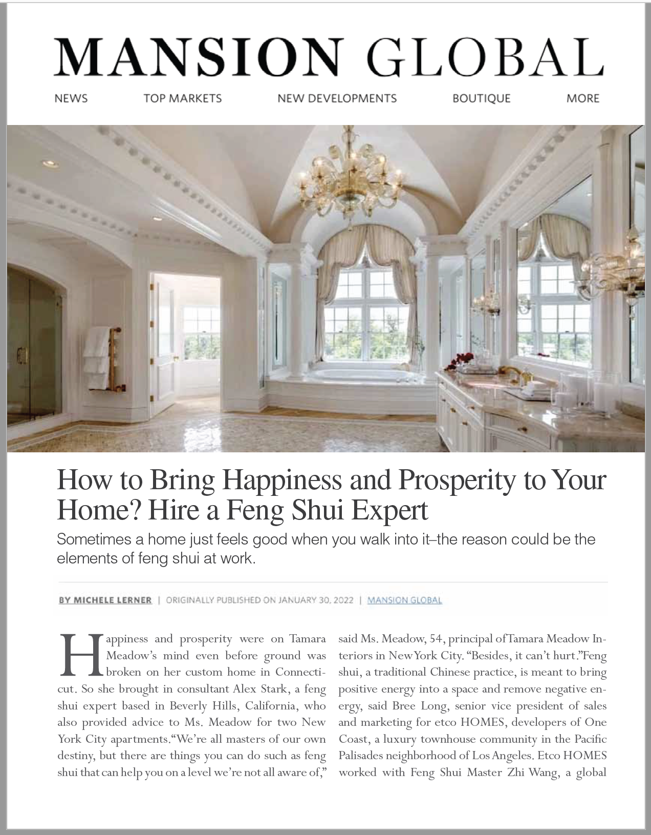“Feng shui consultant Alex Stark, an architect, blends both the practical and transcendental aspects in his practice. He says that although feng shui was introduced to America as a Chinese practice, here and in Europe it’s been transformed into something more holistic.”
