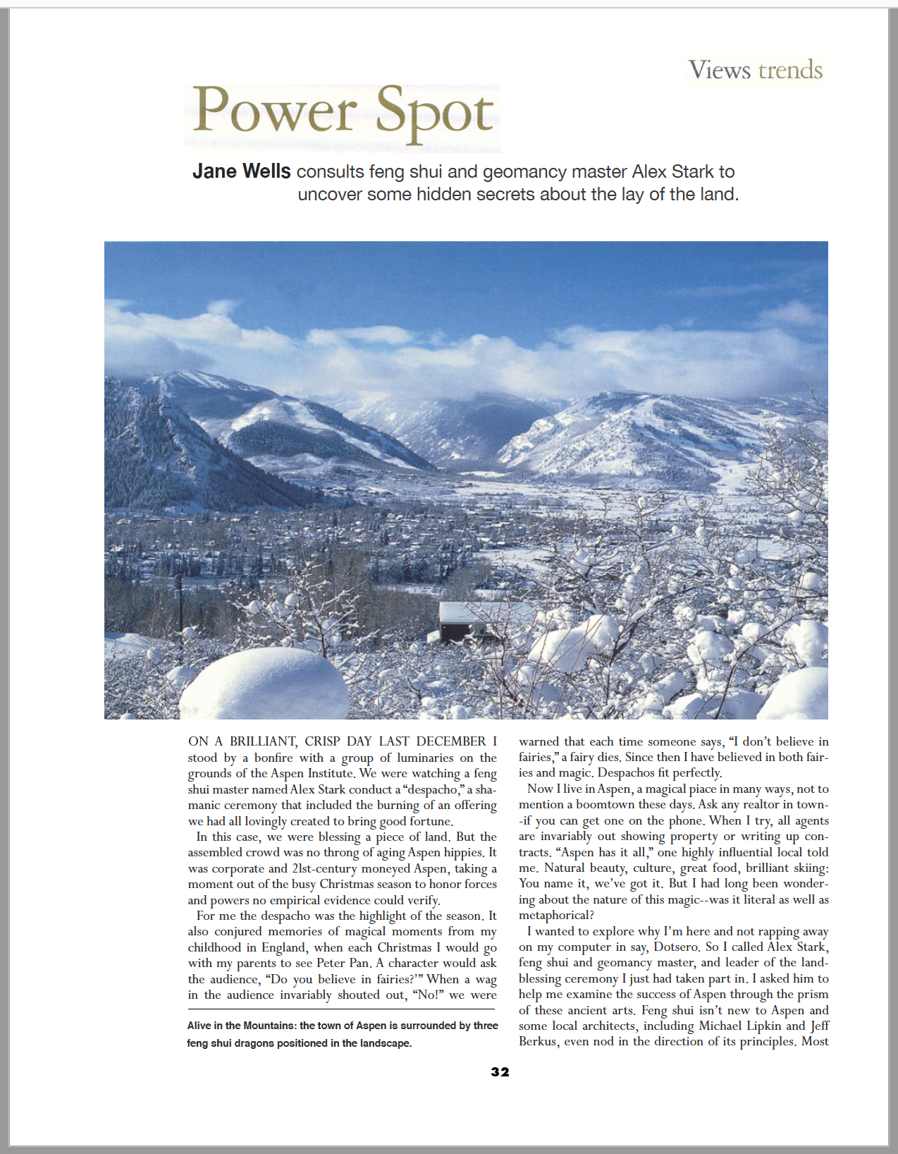 “Jane Wells consults feng shui geomancy master Alex Stark to uncover some hidden secrets about the lay of the land…Stark identified three major dragon formations in the landscape. The first has the fabulous name Golden Bull Pulls Royal Chariot; it surrounds Independence Lake and has a spur that goes all the way down to Red Butte. This type of formation is known in feng shui as a “kingmaker” because it can produce great wealth and power.”