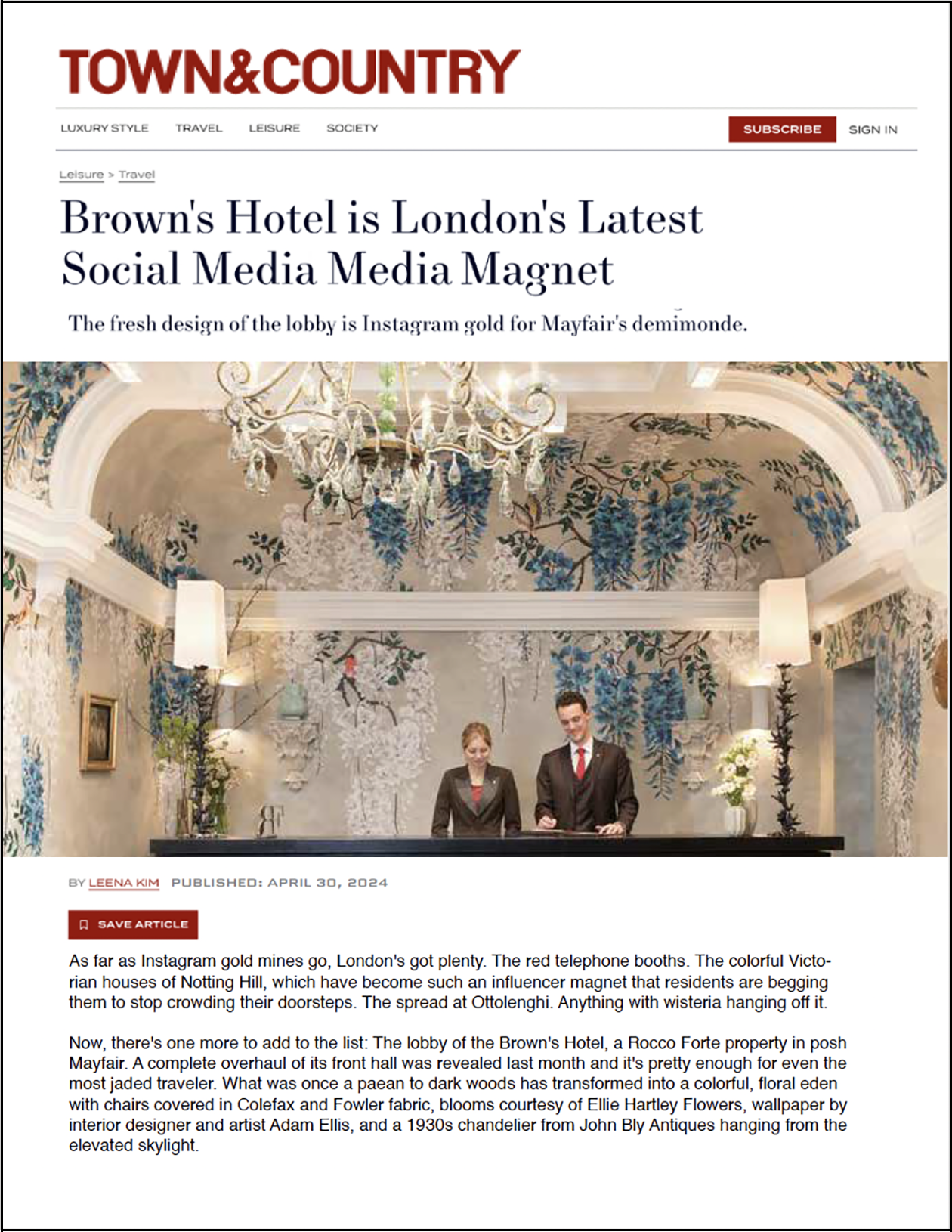 ”As far as Instagram gold mines go, London's got plenty. The red telephone booths. The colorful Victorian houses of Notting Hill, which have become such an influencer magnet that residents are begging them to stop crowding their doorsteps. The spread at Ottolenghi. Anything with wisteria hanging off it. Now, there's one more to add to the list: The lobby of the Brown's Hotel, a Rocco Forte property in posh Mayfair. A complete overhaul of its front hall was revealed last month and it's pretty enough for even the most jaded traveler. What was once a paean to dark woods has transformed into a colorful, floral eden with chairs covered in Colefax and Fowler fabric, blooms courtesy of Ellie Hartley Flowers, wallpaper by interior designer and artist Adam Ellis, and a 1930s chandelier from John Bly Antiques hanging from the elevated skylight.”