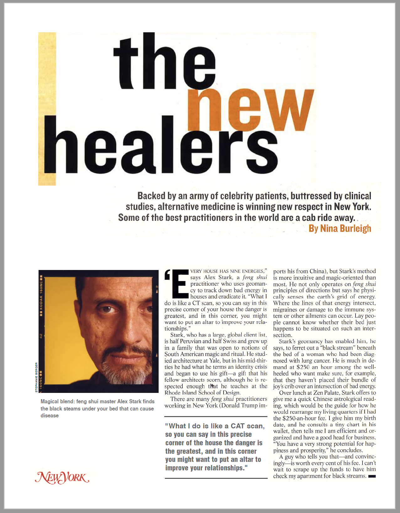 “Alex Stark’s method is more intuitive and magic-oriented than most. He not only operates on feng shui principles of directions but says he physically senses the earth’s grid of energy. Where the lines of that energy intersect, migraines or damage to the immune system or other ailments can occur.”