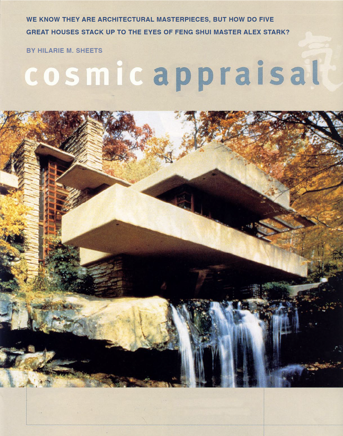 “We know they are architectural masterpieces, but how do five great houses stack up to the eyes of feng shui master Alex Stark? I.D. asked Alex Stark, a Yale-trained architect and feng shui consultant in New York CIty, to assess five iconic houses of 20th-century architecture by Frank Lloyd Wright, Le Corbusier, Mies can de Rohe, Philip Johnson, and Frank Ghery.”