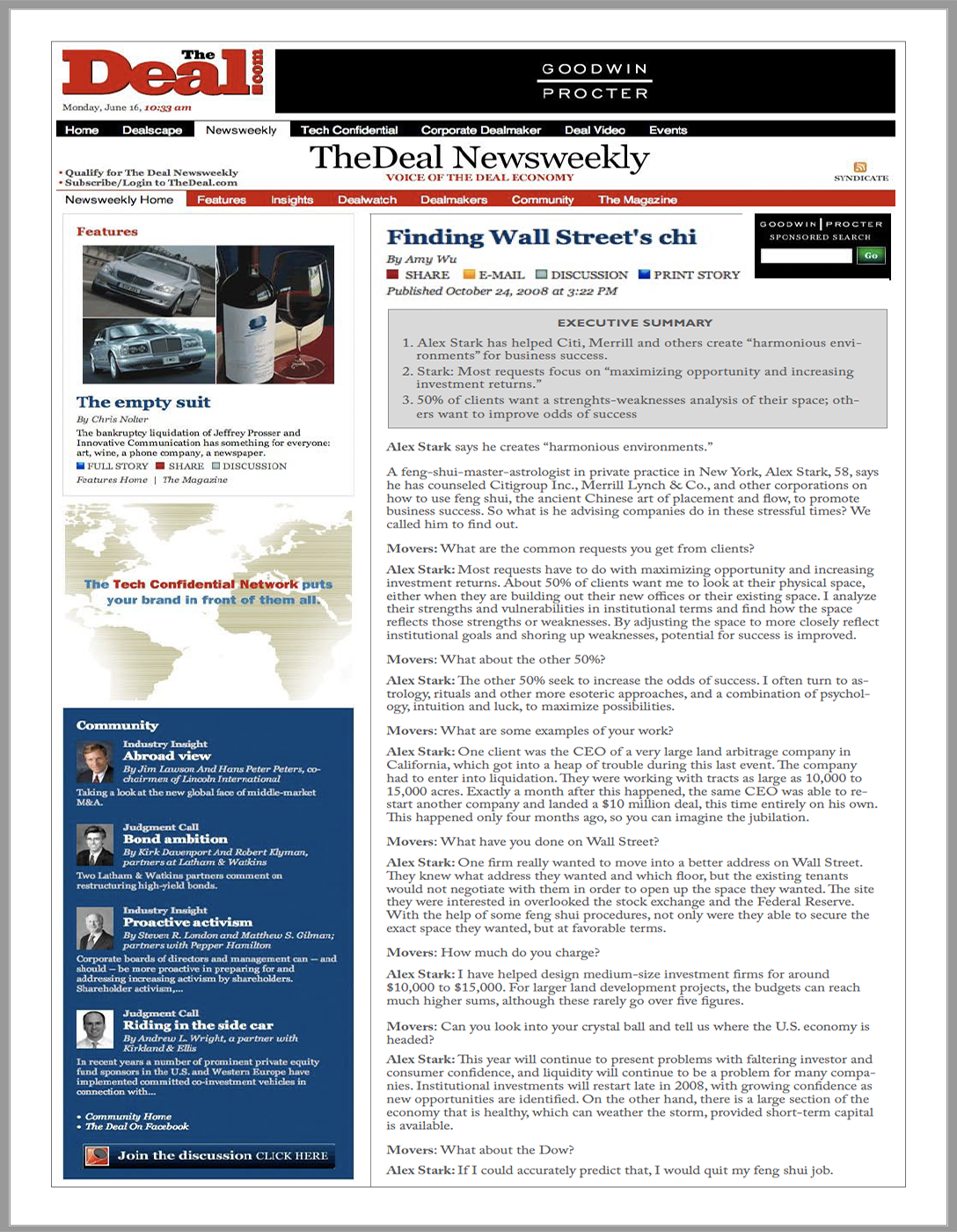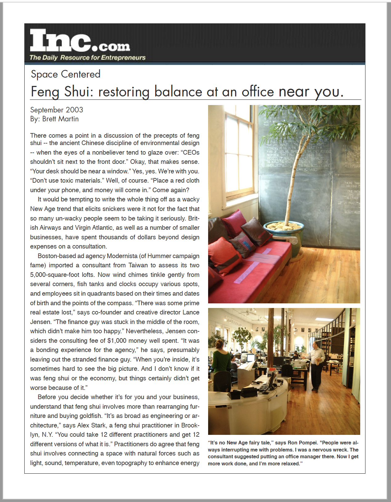 “Alex Stark, who has a private feng shui practice in Brooklyn, has been riding the feng shui crest as it has flowed from an esoteric residential practice primarliy used a s self help tool, to offices and retail spaces, to entire commercial projects.”