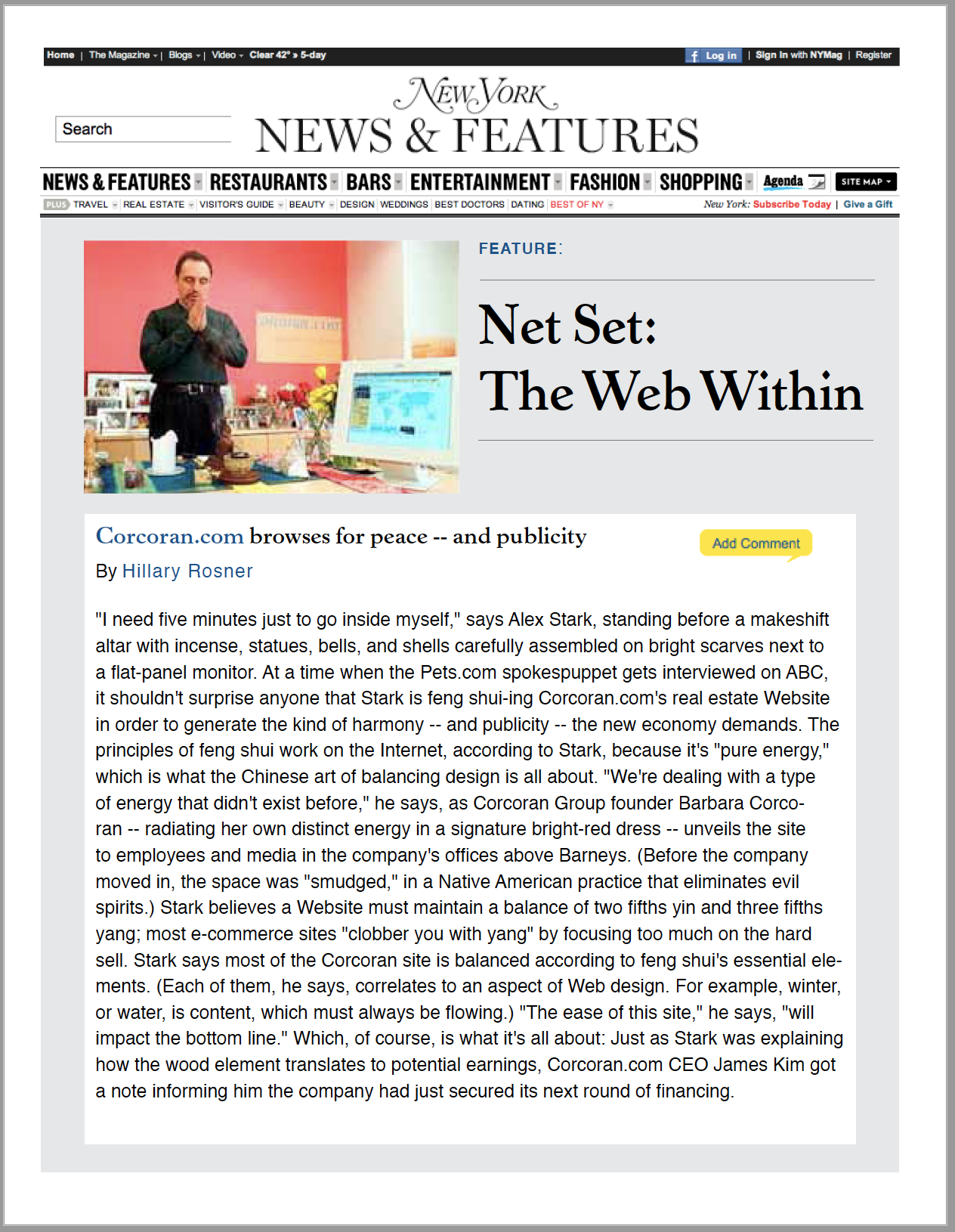 “I need five minutes just to go inside myself,” says Alex Stark, standing before a makeshift altar with incense, statues, bells, and shells carefully assembled on bright scarves next to a flat-panel monitor. At a time when the Pets.com spokespuppet gets interviewed on ABC, it shouldn’t surprise anyone that Stark is feng shui-ing Corcoran.com’s real estate Website in order to generate the kind of harmony — and publicity — the new economy demands.